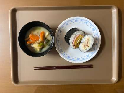 2年生の調理実習で作った、ハムタマおにぎらず・ツナチーズおにぎらず・野菜たっぷり具だくさん味噌汁です。