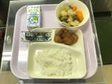 本日のメニューは、牛乳、ご飯、味噌かつ、じゃがいもと野菜の煮物、焼きのりでした。