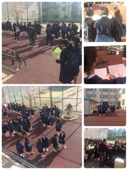 暖かい日差しの中、中庭でクラス発表が行われました。