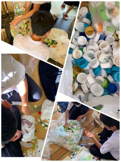 生徒会役員とエコ係はペットボトルキャップの仕分けをしていました。