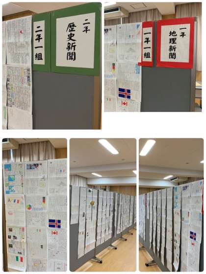 社会科では1年生は地理新聞、2年生は歴史新聞を展示しています。