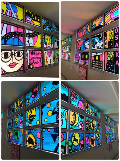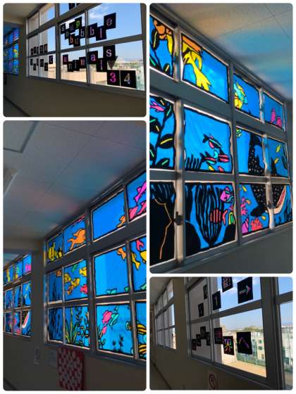 4階の廊下には1年生のステンドグラスが彩り鮮やかに輝いていました!