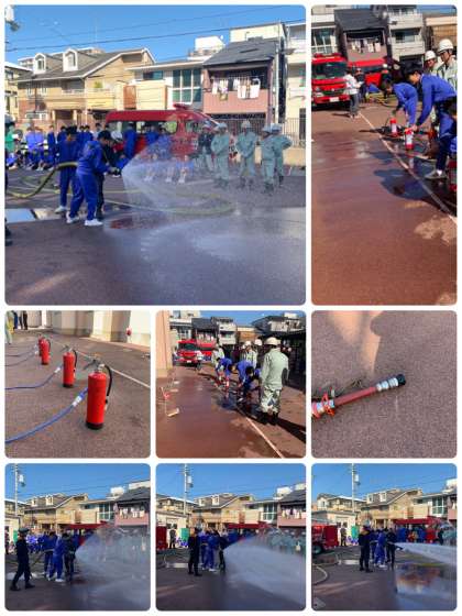 写真は、可動式ポンプ訓練、消火器訓練の様子です。
