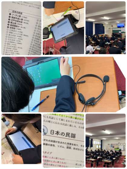 タブレット端末にイヤホンをつけて自分のお気に入りの民謡を探しレポートを作成しました。