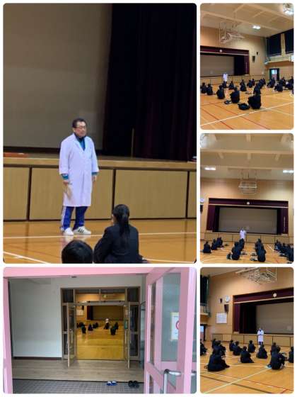 事前指導を急遽体育館で行い、感染拡大防止のために間隔を開けて座りました。