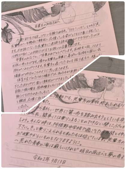 在校生代表のメッセージは配布物セットに、卒業生代表のセットは登校時に配布されるのでじっくり読んでみましょう。