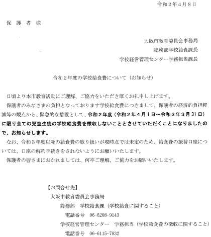 学校給食費を徴収しない