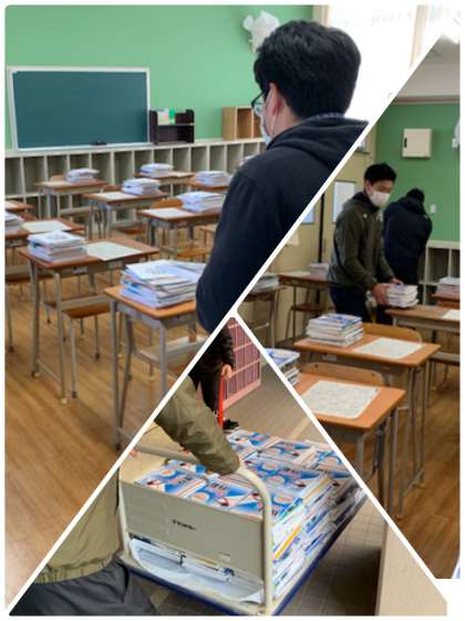 来週、月曜日、火曜日に行われる教科書等配布日に向けて、スムーズに渡せるように仕分け作業を行なっています。