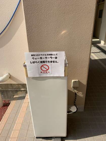 感染予防のためウォータークーラーはしばらく使用できません。水分を多めに持ってきましょう。