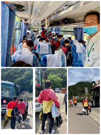 昼食を終えて、ラフティングの説明。そのままスエットスーツに着替えてバスに乗車。