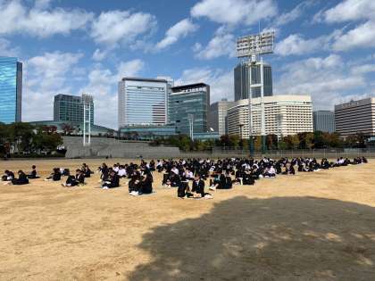 今から太陽の広場で間隔を開けて昼食です。