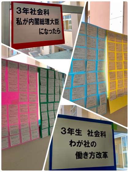 3年生の廊下には社会科の取り組みが掲示していますのでご覧ください。