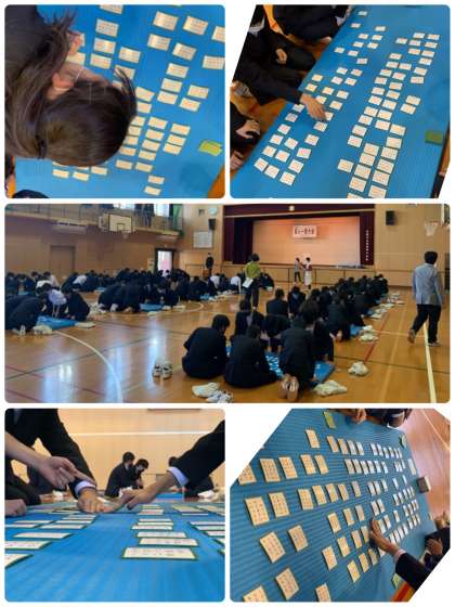 風流な音楽が流れる中、真剣な眼差しで札を見つめていました。