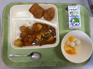 今日の給食の献立は、 カツカレーライス フルーツ白玉 牛乳 です。