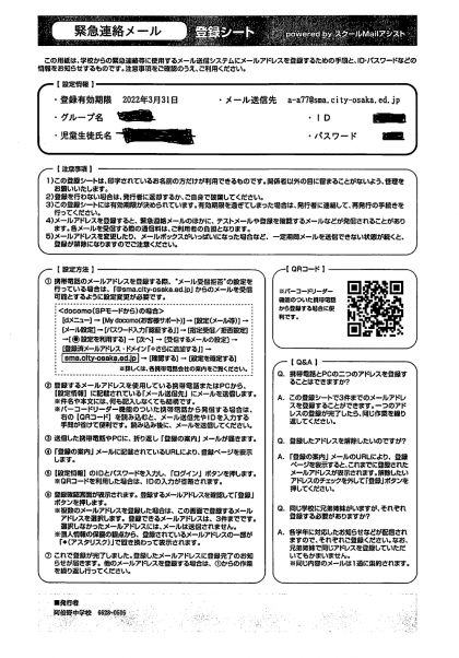 本日(4月16日)、担任の先生から子どもたちへ「保護者メール 登録シート」を配布いたしました。学校からのお知らせ、緊急な対応が必要な場合に保護者メールを活用して保護者のみなさまへご連絡をいたします。ぜひこの機会にご登録ください。
