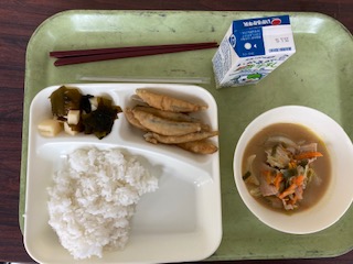 本日の給食の献立は、 きびなごてんぷら 豚汁 わかたけ煮 ごはん 牛乳 です。
