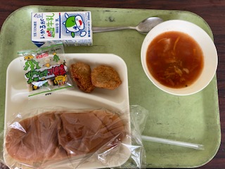 本日の給食の献立は、 一口トンカツ ミネストローネ 豆こんぶ パン 牛乳 です。