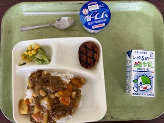 牛肉と大豆のカレーライス 焼きミニハンバーグ レタスとコーンのサラダ