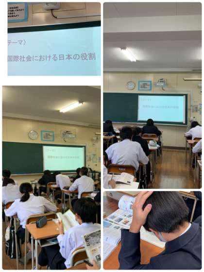 3年の社会科では歴史的分野のまとめとして、学習した内容をふまえて、「国際社会における日本の役割」というテーマで考えました。
