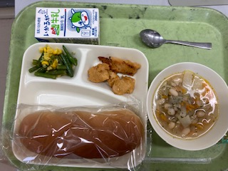 鶏肉のカレーマヨネーズ焼き てぼ豆のスープ さんどまめとコーンのサラダ パン りんごジャム 牛乳