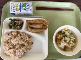 かやくご飯 いわしのてんぷら 五目汁 牛乳