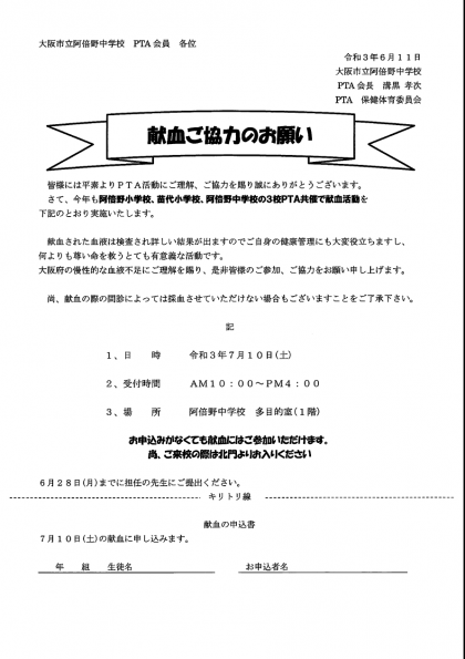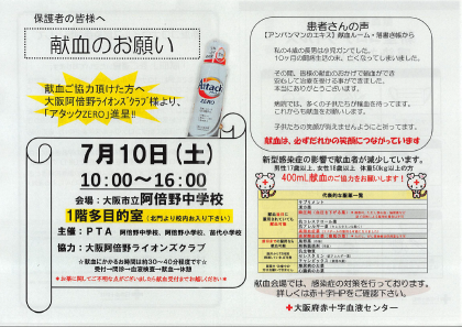 本日、子どもたちへ「献血ご協力のお願い」のプリントを渡しております。阿倍野小学校、苗代小学校、阿倍野中学校の3校PTA共催で献血活動を7月10日(土)に阿倍野中学校 多目的室で午前10時〜午後4時まで行います。どうか、奮ってご参加ください。