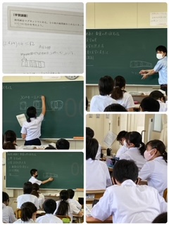 1年生の数学の授業で「文字の式」の単元で数量を文字であらわすことについて、[学習課題:画用紙をマグネットでとめる。30枚の画用紙をとめるとき、マグネットはいくついるか考えよう。]を自分で考え、グループで考え、考えを共有しました。考えたことを自分の言葉で数学の言葉を使って表そうと先生のお話に対して子どもたちは楽しく考えました。