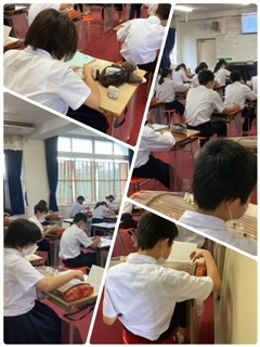1年生の音楽の授業で、和楽器の活用の授業で箏の「奏法」について子どもたちは学びました。「さくらさくら」を箏で奏でました。