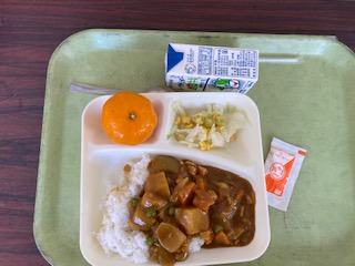 チキンカレーライス キャベツとコーンのサラダ[ノンエッグドレッシング]みかん 牛乳