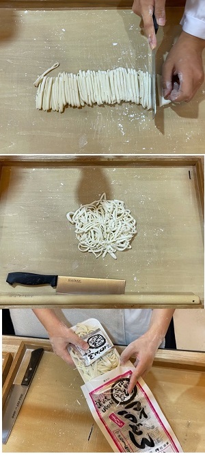 子どもたちが作ったうどんです。袋詰めをしてお土産に持って帰れるのかな?