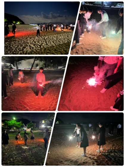 夕食後、修学旅行最後の夜はホテルを出て海岸へ行き、花火をしました。3年生のみんなで行う花火は良い思い出となりました。秋の岡山の夜空を堪能しました。