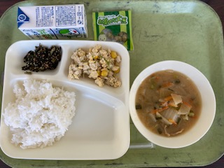 ささみと卵のいり煮 みそ汁 ごまひじき まっ茶大豆