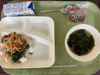 本日の給食の献立は、 ビビンバ わかめスープ アーモンドフィッシュ 牛乳 です。