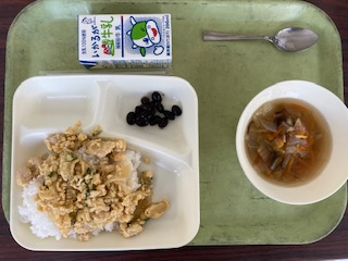 本日の給食の献立は、 親子丼 すまし汁 黒豆の煮もの 牛乳 です。