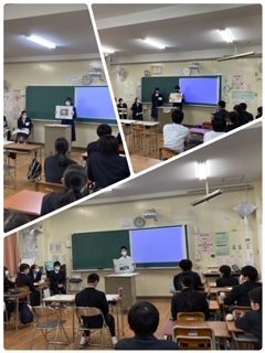 午後2時から日本語教室の子どもたちが3グループに分かれて、1組〜3組までローテーションで20分間隔で訪れて、阿倍野中学校の1年生の子どもたちと交流をしました。テーマは3つあり、「名所」「食」「行事」について母国の紹介と日本の紹介を双方向から行い、お互いの国の文化等について共有し、日本語教室の生徒さんとつながりました。