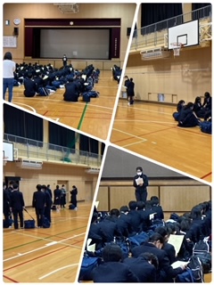 6時間目、3年生は明日大阪府で行われます私立高校入試の事前指導を体育館で行いました。進路指導主事の徳山先生より明日に向けての4つの大切なお話がありました。