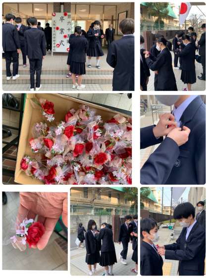 卒業生が登校してきました。 2年生の手作りのコサージュを胸につけてもらっています。