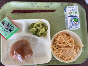 さけのクリームスパゲッティ キャベツときゅうりのサラダ ソフト黒豆