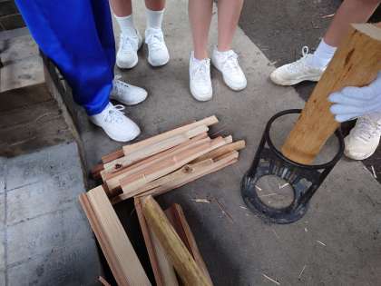 竈係りが巻を細かく割って、火がおこしやすいようにしていきます。そして