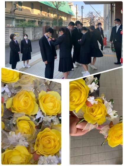卒業生が登校してきました。 玄関では2年生の手作りによるコサージュをつけ、卒業に花を添えています。