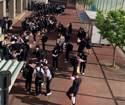 4月10日(月) 新学期がはじまりました。朝早くから中庭に集合し、クラス発表を待っています。