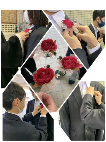 卒業生が登校しました。 2年生が作成したコサージュを添えて卒業式に臨みます。