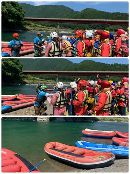 学級写真撮影後ガイドさんからの紹介、ラフティングについての説明を受けます。