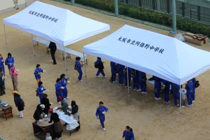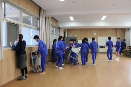 終了後は、PTA等の方々が準備してくださった「炊き出し」の配給で、豚汁とおにぎりをいただきました。豚汁はとても美味しくて、お代わりをいただく生徒も多かったようです。PTAのみなさん、青少年指導員連絡協議会のみなさん、学校元気アップ委員会のみなさん、ありがとうございました。