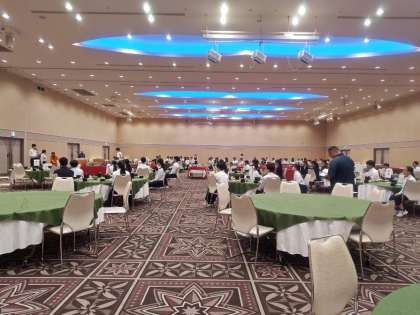 ホテルに到着後、荷物をそれぞれの部屋に置き、夕食会場に集合しました。 まずは、入所式です。