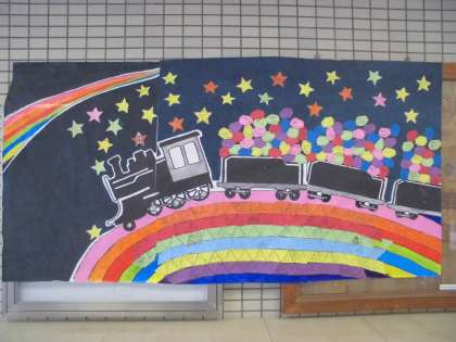 卒業生のメッセージを汽車にのせて、未来へ運ぶ形で表現しながら、在校生と職員からのメッセージを「レール」と「汽車を見守る☆星」に見立てて作成しました。先輩たちへの感謝とお祝いの気持ち、3年生にきっと伝わることでしょう。