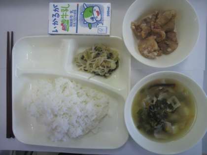 4月20日(木)給食の献立は、鶏肉のからあげ・中華スープ・チンゲンサイともやしの甘酢あえ・米飯・牛乳でした。