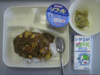 5月8日(月)給食の献立は、牛肉と大豆のカレーライス・レタスのサラダ・ヨーグルト・牛乳でした。