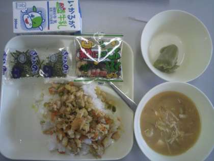 5月10日(水)給食の献立は、かやくご飯・みそ汁・まっ茶ういろう・豆こんぶ・牛乳でした。