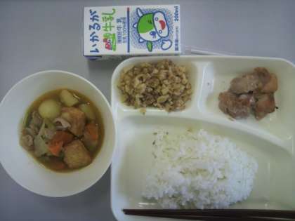 5月11日(木)給食の献立は、鶏肉のてり焼き・じゃがいもとあつあげの煮もの・ごまかかいため・米飯・牛乳でした。